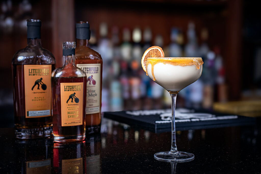 Anastasia’s Warm and Toasty cocktail is a true trifecta of Litchfield Distillery flavor, showcasing our Maple Bourbon, Crème de Maple Liqueur, and popular Bourbon-Barrel Maple Syrup in one indulgent pour. While beautifully sweet and inviting, it’s thoughtfully balanced — with house-made chai syrup adding a perfect touch of spice and complexity that keeps the cocktail from ever feeling overdone. Finished with a caramel-glazed rim kissed with sugar and cinnamon, it’s layered, comforting, and perfectly composed — a fireside-worthy sip that lives up to its name.
